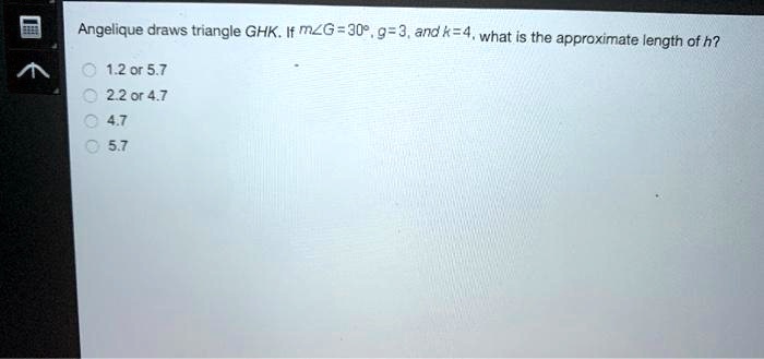 Angelique draws triangle GHK. If mzG=30? 9-iii, and k=iv,what is the approximate length of h? 1.2 or 5.7 22or iv.seven 47 5.7