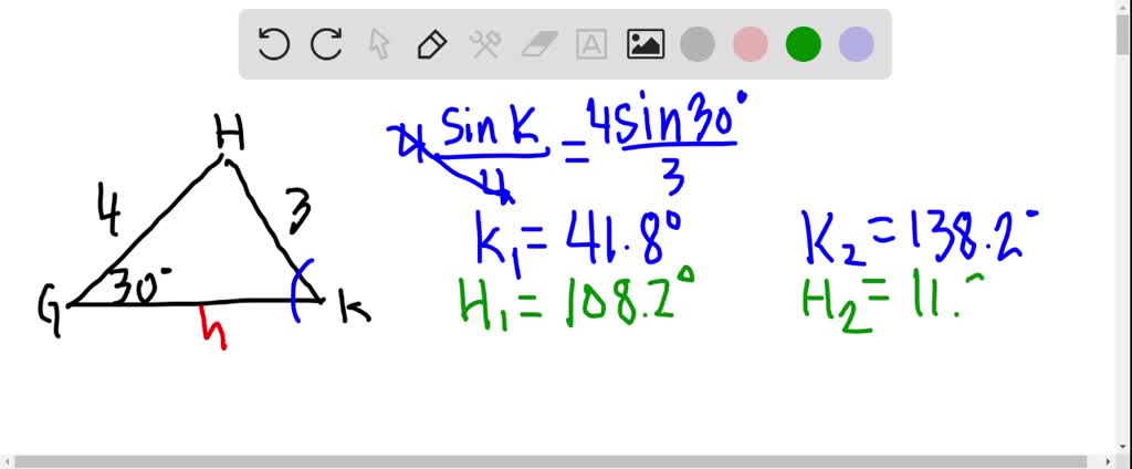 to answer this question. Nosotros volition use the law of sines. The first matter nosotros have to practise is to find the measure out of angle K. Sine of K over the length of its reverse side is equal to sine of thirty over the length of its contrary side. Multiply both sides by four and accept the inverse sine. Make sure your calculator is in degree mode and you lot will become 41 0.viii degrees. This is an ambiguous case. Then that's actually triangle 1 angle K. In triangle too is the supplementary angle. And so decrease 41.8 from 1 eighty And we get one 38.2. With that information nosotros tin find angle H. In each triangle. Subtract from 1 80 bending 1000. An angle M. Mhm. Yep. Do the aforementioned thing for triangle likewise. Yeah. Yeah. And finally nosotros can answer the question. Using the law of sines. Aye. Aye. Oh yes yep. Sorry about all that noise. If you heard it, I alive virtually a fire station and the burn trucks drive right by my window sometimes but we can continue solving, we volition prepare up an equation for each of the triangles. Yeah. So I will multiply both sides of the equation to solve for H. Three times sine of 10. Divided past Sine of 30. Okay Is a length of 5.7. And in my other triangle iii Times sine of 11.8 divided by sine of xxx Is 1.2. Yeah. It looks similar the showtime reply pick Is the correct ane